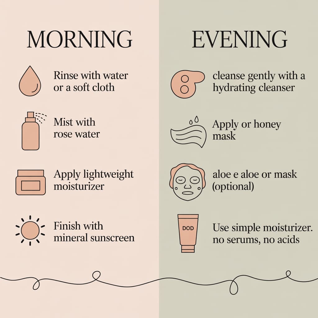 After cleansing, use one simple hydrating product, maybe an aloe vera gel, rose water mist, or fragrance-free moisturizer. Focus on moisture, not actives.