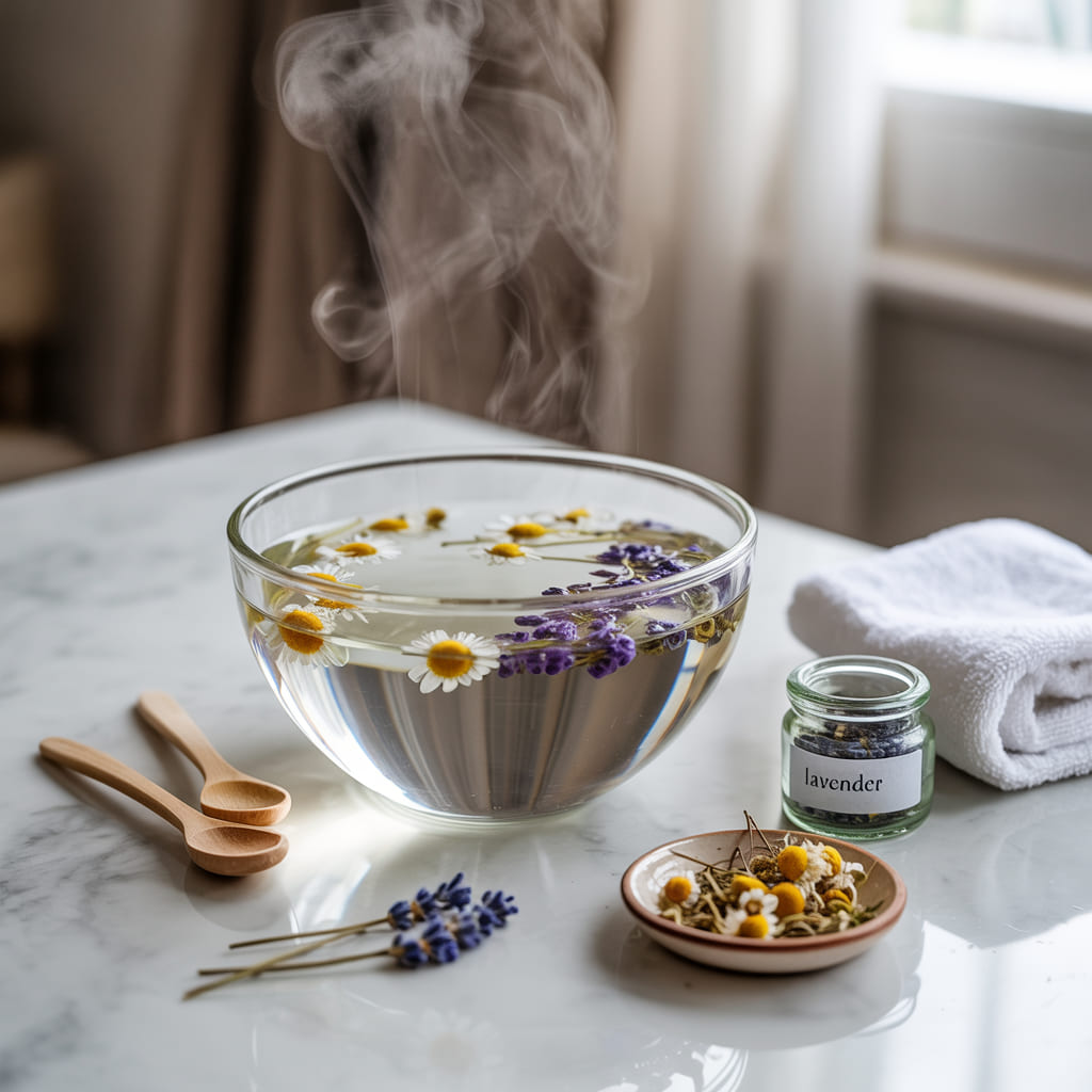 Pour the herbs into the bowl, lean over gently, and let the steam rise to your face. I always keep my eyes closed and breathe slowly. Five to seven minutes is enough. The steam softens my skin and my heart at the same time.